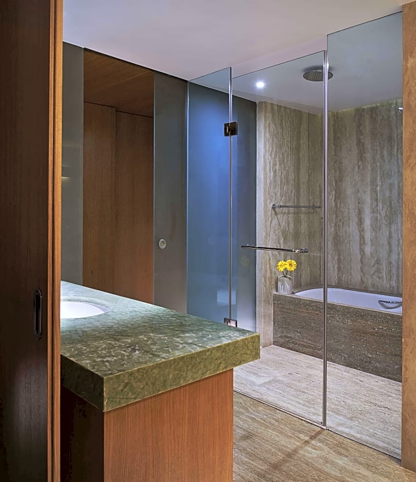 Featuring floor-to-ceiling windows, this suite offers panoramic views of the city greenery. The premium suite comes with marble flooring, a separate living room, interconnecting room option, a Nespresso coffee machine and access to the fastest hotel Wi-Fi connectivity in the city. It includes an oversize work desk, flat-screen satellite TV, iPod dock and an in-room safe, Complimentary two-way airport transfers, Oversize marble bath tub, Complimentary one-time Mini-bar, Separate bedroom and living space, Espresso machine and tea-making facilities with supplies.